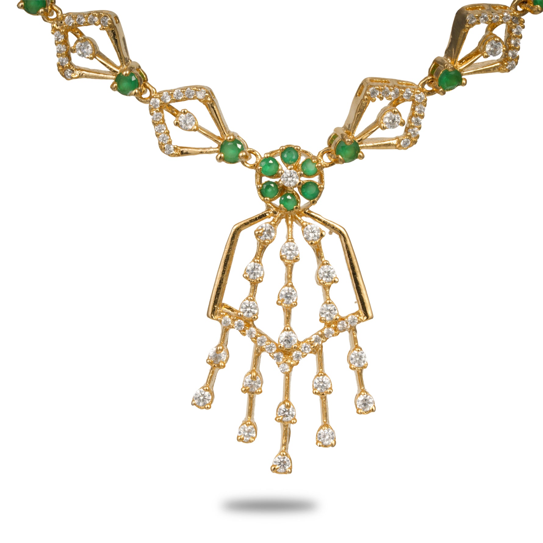 Unit price perA richly adorned necklace set featuring a fully embellished neckline with brilliant stone detailing. The structured design offers depth and texture while maintaining graceful balance. Crafted over a radiant gold-coated base, it reflects light beautifully from every angle. The matching earrings mirror the same intricate brilliance. A perfect choice for grand celebrations and wedding occasions.
