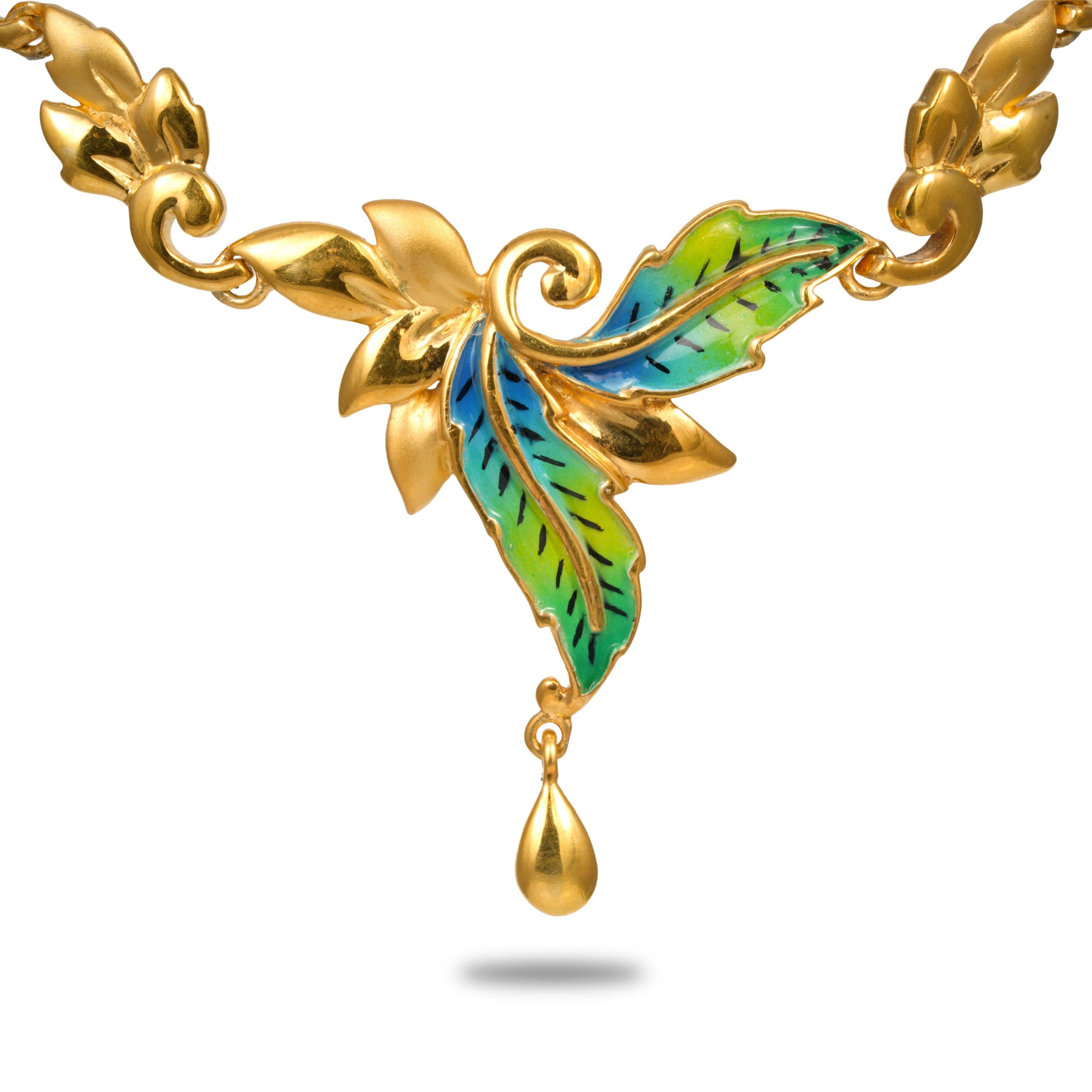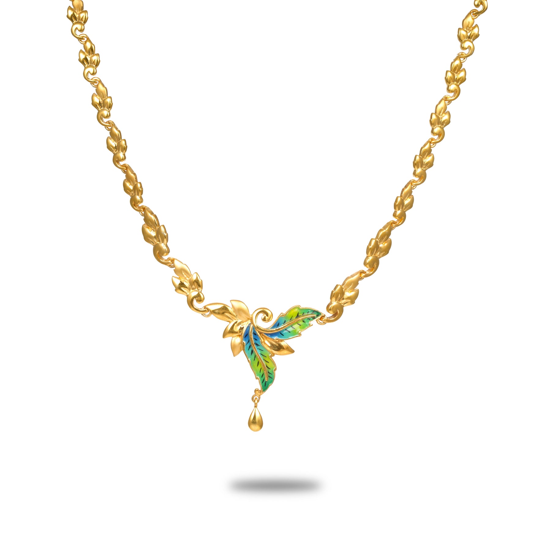Unit price perA graceful short necklace adorned with intricately crafted leaf motifs, fully gold coated to radiate warmth and timeless charm. The centerpiece features two delicately designed leaves highlighted in rich green tones, symbolizing freshness and renewal. A subtle hanging accent enhances the pendant’s movement, adding depth and sophistication to the design. Polished to a luminous finish, this necklace blends nature-inspired artistry with classic elegance. Perfect for festive occasions, formal gatherings, or elevating everyday ensembles with refined beauty.